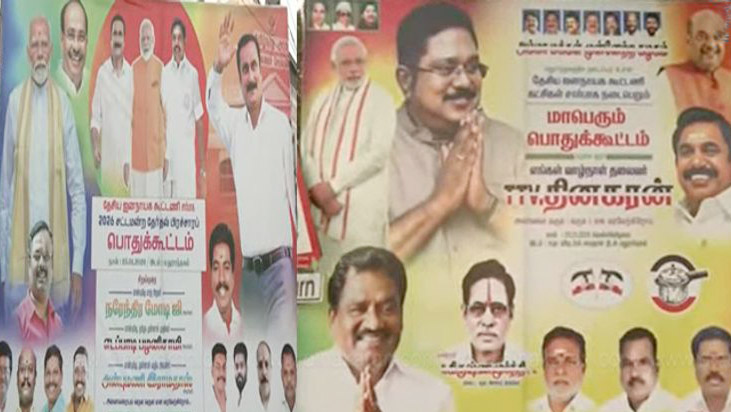 மதுராந்தகத்தில் இன்று நடைபெறும் தேசிய ஜனநாயகக் கூட்டணியின் பொதுக்கூட்டத்துக்காக அதிமுக தரப்பில் வைக்கப்பட்டுள்ள பேனர்களில் அமமுக பொதுச் செயலர் டிடிவி தினகரனின் புகைப்படம் புறக்கணிக்கப்பட்டுள்ளது.