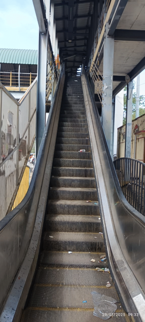 தாம்பரம் சானிடோரியம் பேருந்து நிலையம், தேசிய சித்த மருத்துவம் அருகே உள்ள பொதுமக்கள் சாலை கடக்கும் மேம்பாலத்தின் நகரும் படிக்கட்டு உள்ளது. இது சுமார் ஆறு மாதங்களுக்கு மேலாக வேலை செய்யவில்லை,இது குறித்து புகார் அளித்தால் தற்போது வரை எந்த நடவடிக்கை இல்லை, அதன் அருகே கட்டப்பட்டு வரும் மின் தூக்கி வேலையும் ஆமை வேகத்தில் நடைபெறுகிறது, இதனை உடனடியாக சரி செய்து மக்கள் பயன்பாட்டுக்கு கொண்டு வர நடவடிக்கை எடுக்குமாறு பல்லாவரம் சமூக ஆர்வலர்