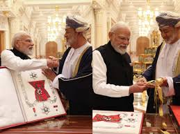 ஓமன் நாட்டுக்கு வருகை தந்த பிரதமர் மோடிக்கு நாட்டின் உயரிய விருதான ‘ஓமனின் முதல்தர விருது (The First Class of the Order of Oman – தி ஃப்ர்ஸ்ட் கிளாஸ் ஆஃப் தி ஆர்டர் ஆஃப் ஓமன்) வழங்கி மன்னர் சுல்தான் ஹைதம் பின் தாரிக் கௌரவப்படுத்தினார்.