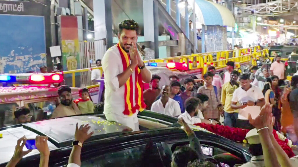 சென்னை பனையூரில் உள்ள தமிழக வெற்றி கழக தலைமை அலுவலகத்தில் இன்று 6 ம் கட்டமாக 19 மாவட்ட செயலாளர் பதவி அறிவிப்பு நிகழ்ச்சி நடைபெற்றது.இதில் செங்கல்பட்டு வடமேற்கு மாவட்ட செயலாளராக சரத்குமார் என்பவருக்கு பதவி வழங்கப்பட்டுள்ளது. அதனைத் தொடர்ந்து பனையூரில் இருந்து தாம்பரம் வந்த அவருக்கு த.வெ.கவினர் மேளதாளங்கள் முழங்க உற்சாக வரவேற்பு அளித்தனர்.புதிய மாவட்ட செயலாளர் வருவதற்கு 2 மணி நேரத்திற்கு முன்னரே தாம்பரத்தில் எப்போது பரப்பரபாக உள்ள பேருந்துநிலையம் ஜி.எஸ்.டி. சாலையில் தொண்டர்கள் குவிய தொடங்கினர்.இந்த நிலையில் 2மணி நேரம் கழித்து